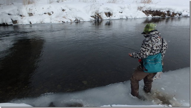 緩い流れのプールでは降り積もった雪が解けきらずに川一面がシャーベット状になっています。