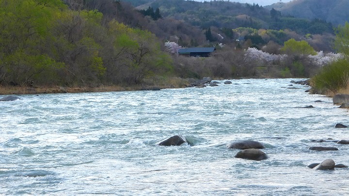 目的の川の近くでは桜が満開。季節の進行具合はドンピシャという感じです。
