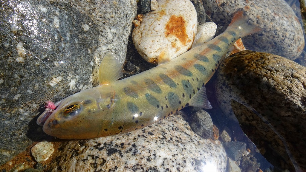 誰かのフライをお腹にくっつけたまま釣れたヤマメ。救助してあげました。