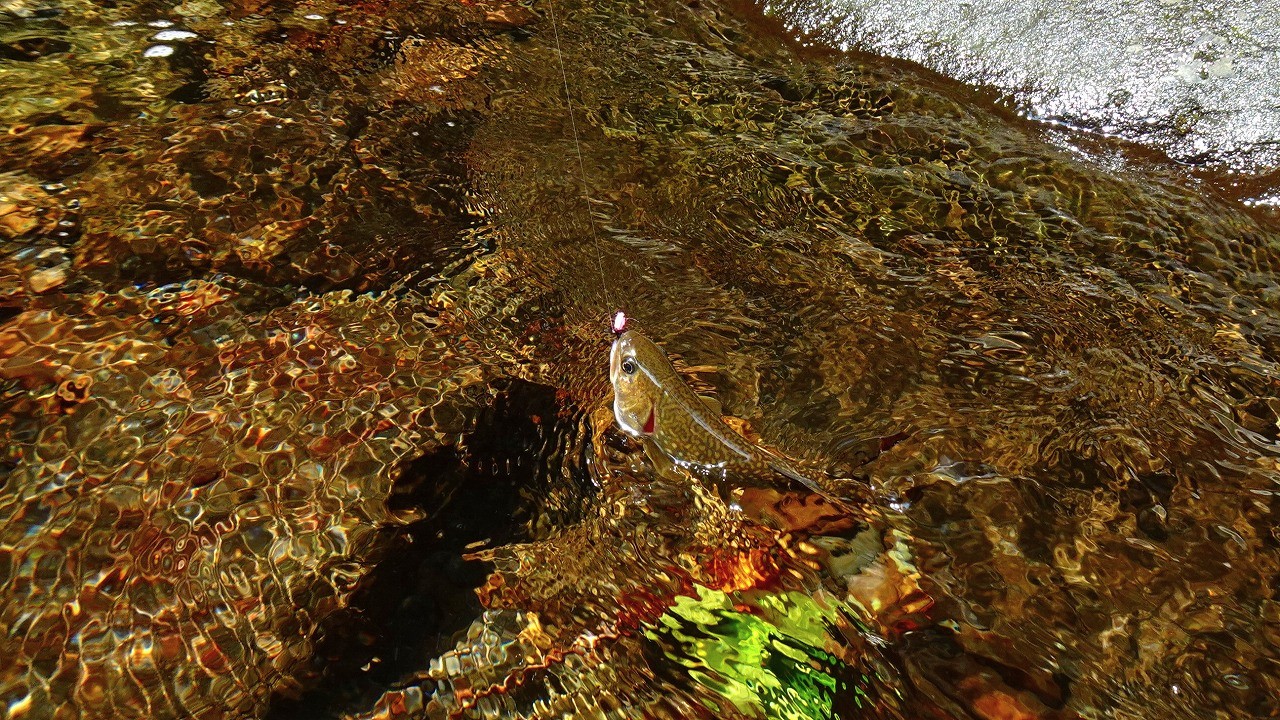 流れは細いですが滝壺はいい感じで水が溜まっています。とりあえず開きにフライを落とすと一発で食ってきました。