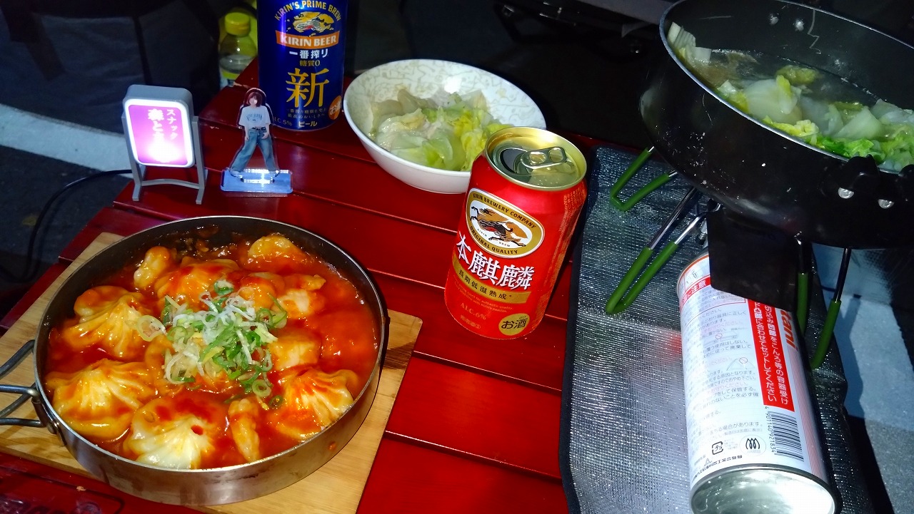 白菜のミルフィーユとエビチリと小籠包。ビールが進むススム。