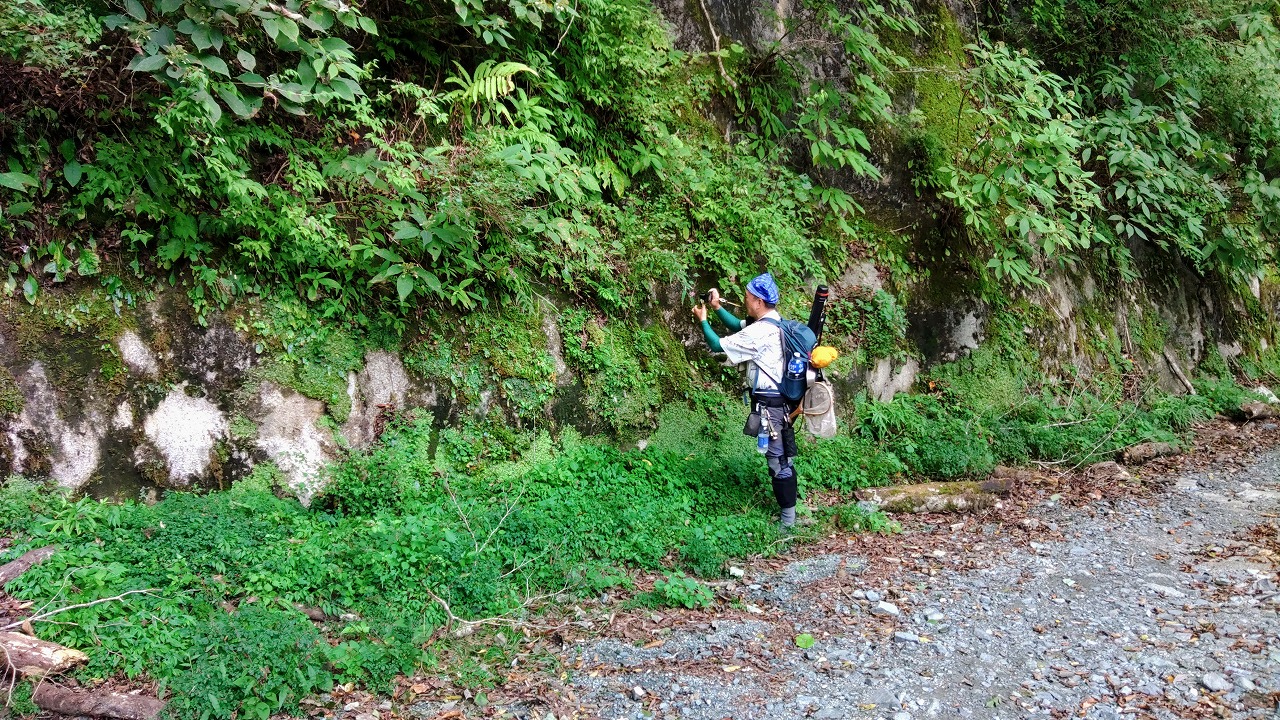 今回の目的地です。ここからこの岩盤をヘツッてひとつ斜面を超えたところから釣りスタートです。