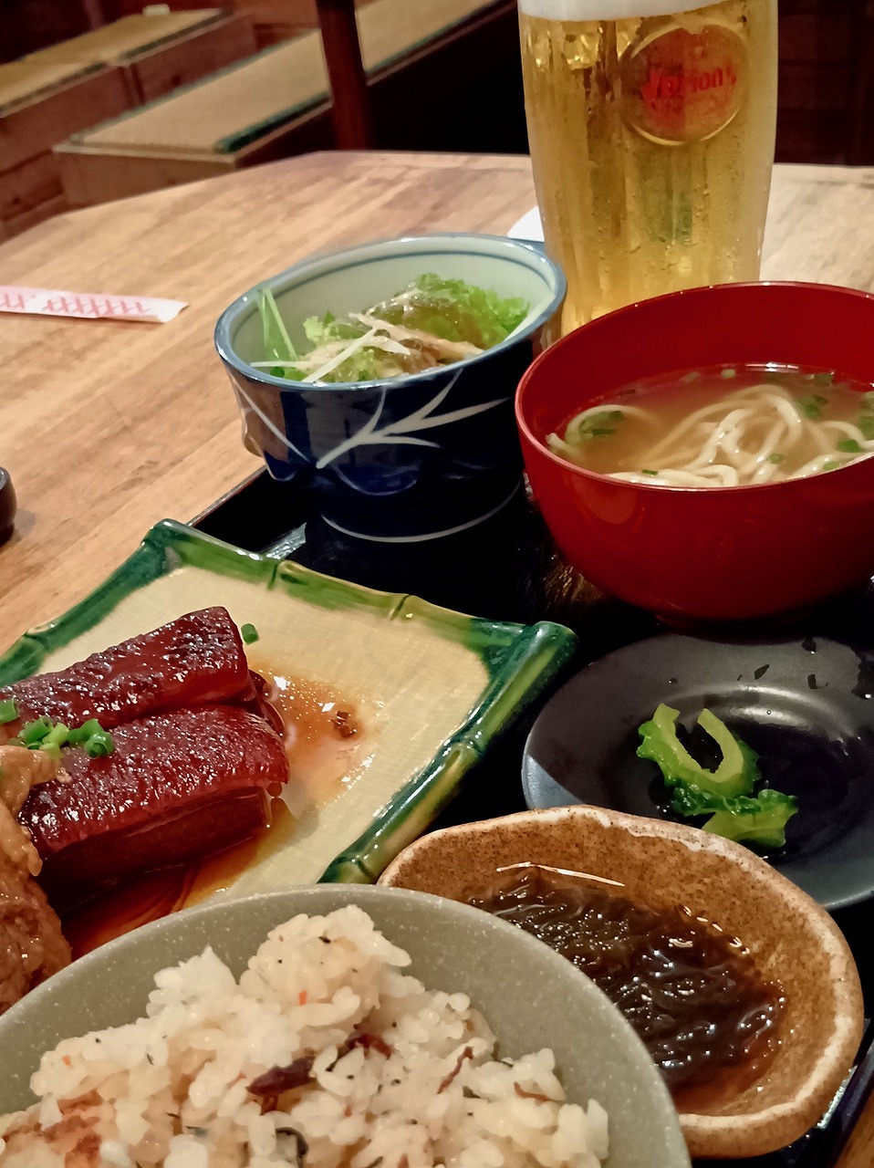 夜は地元のオリオンビールと郷土料理のラフティーで祝賀会。
