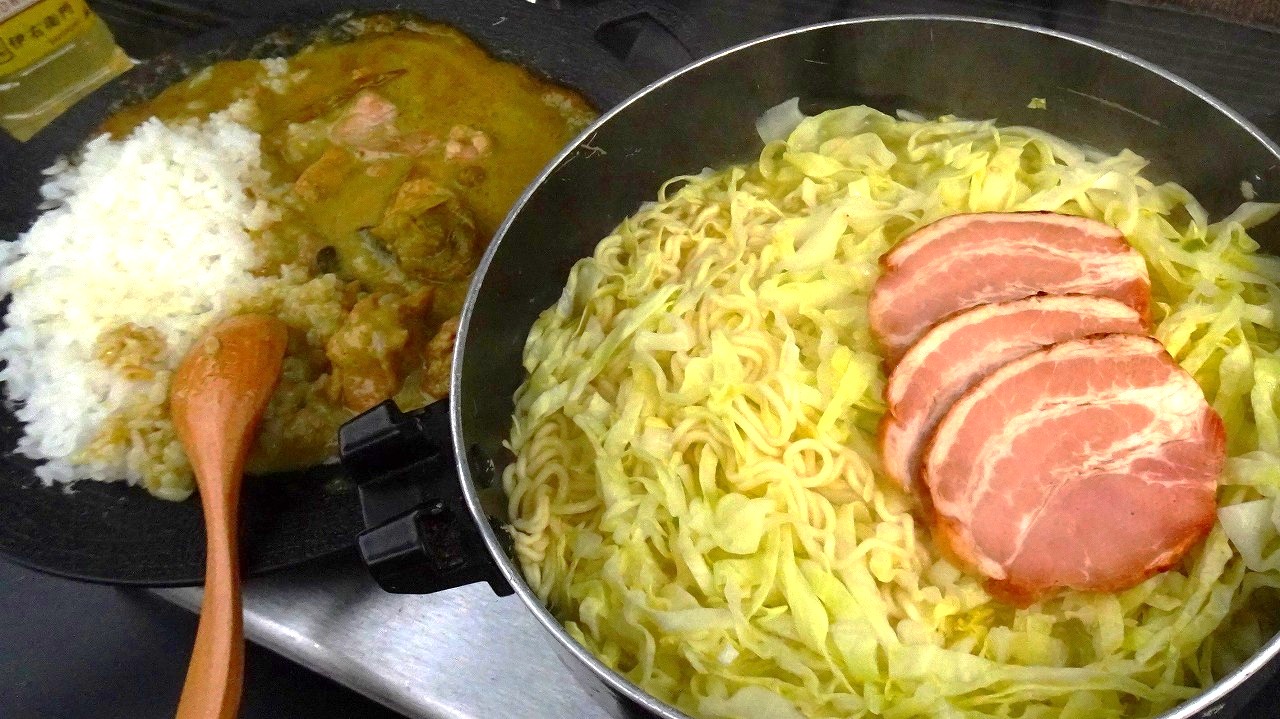 syatyouさんのラーメンと自分のグリーンカレー。こんな寒い日には最高のごちそうです。