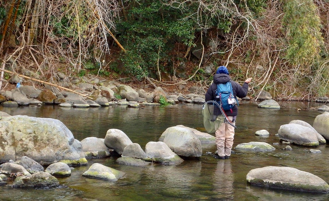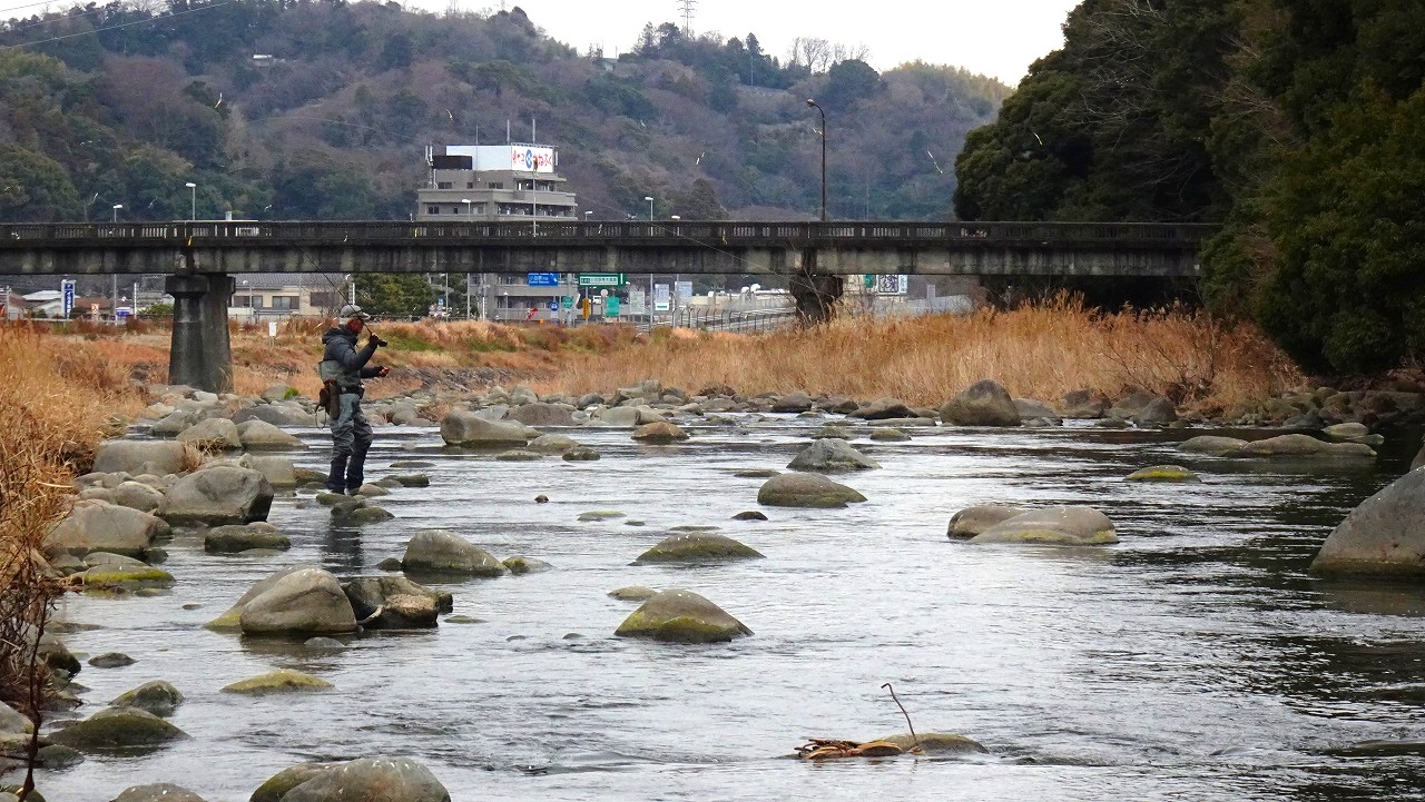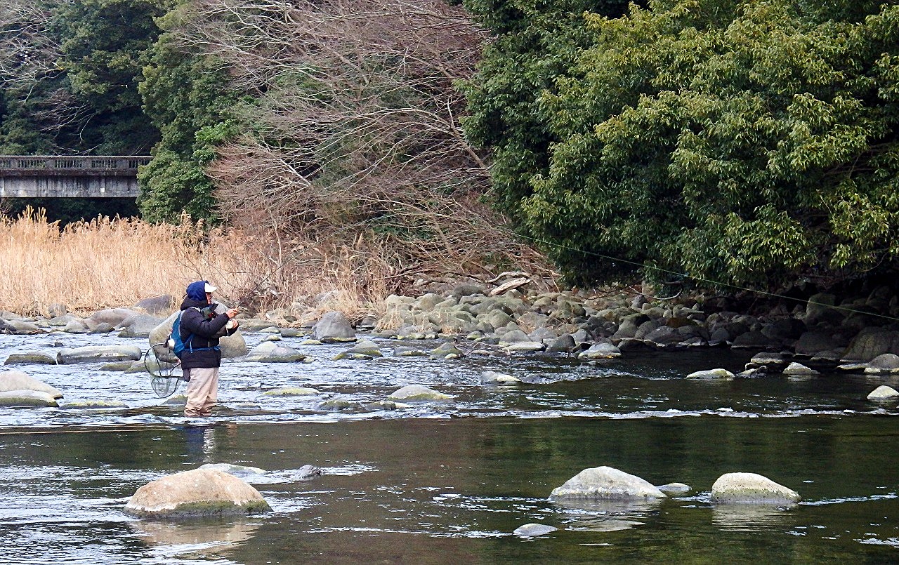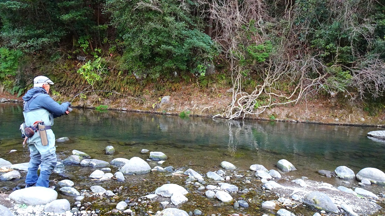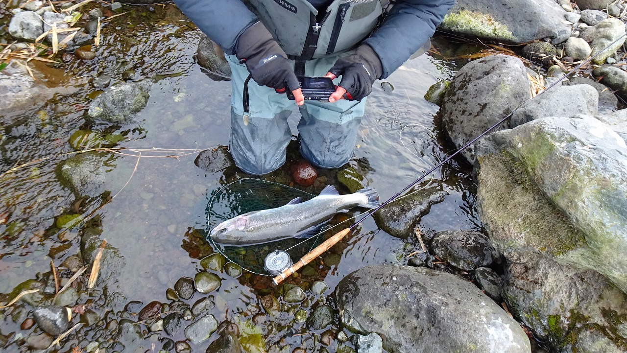 この時間、この寒さではハッチもライズも期待できないので少しでもやる気のありそうなニジマスを見つけて狙います。