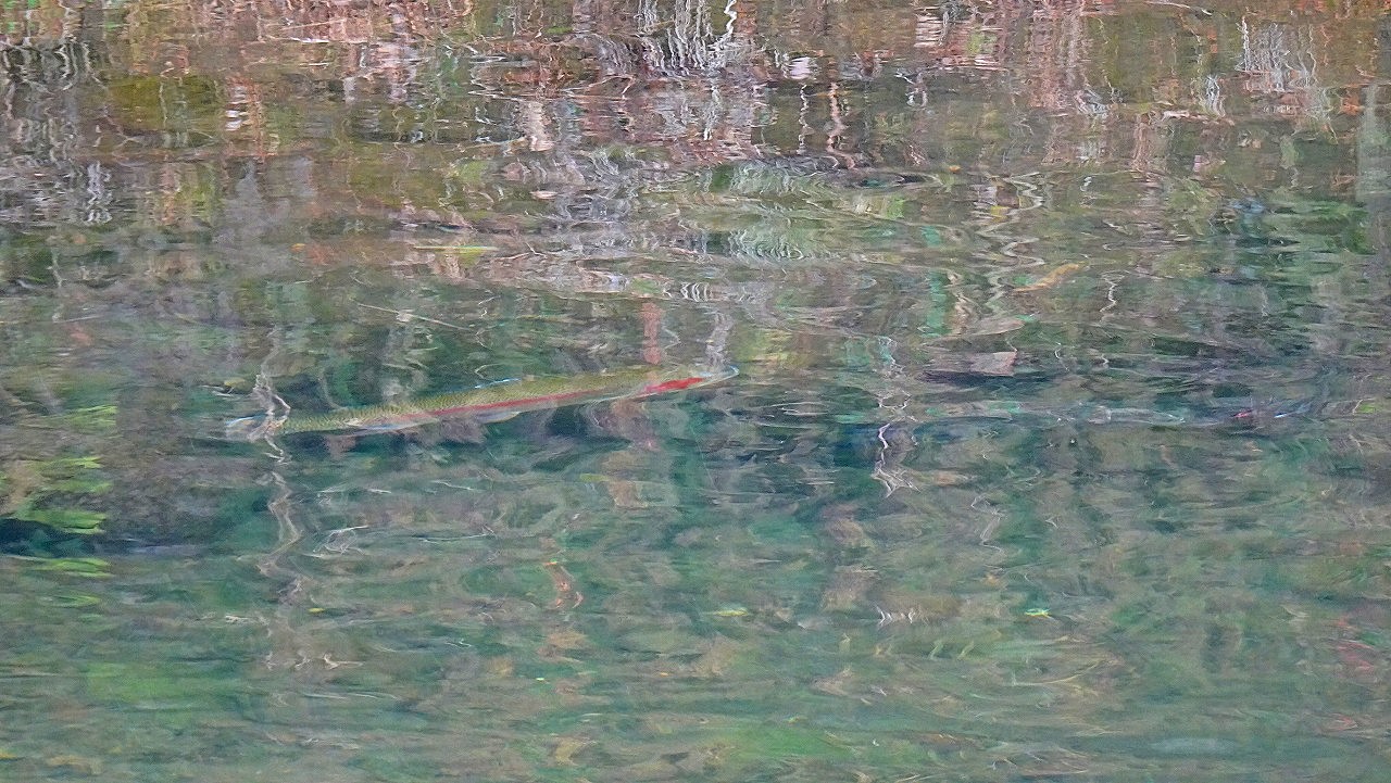 そして堰堤下を見に行くと水中でふらふらしているやる気ありそうなニジマスが見えます。